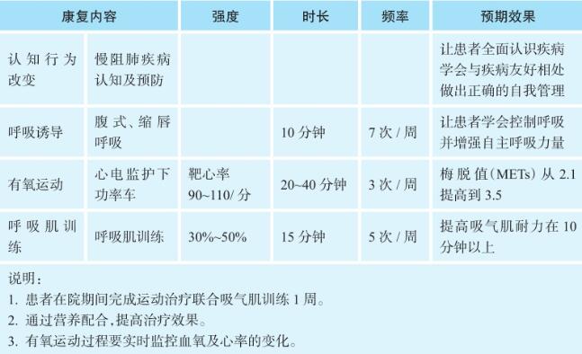 运动处方①有氧运动:踏车或者快走,每次15分钟,每周5次。达到Borg气促评分2分(轻度呼吸困难),Borg劳累评分13~14(有点用力),运动中补充氧气,保持SpO2不低于90%。②抗阻运动:上肢抗阻训练利用弹力带、哑铃进行抗阻,抗阻时吸气回复原位,呼气用力,动作要慢。③呼吸肌训练:强度10cmH2O,每次15分钟,每周7次。