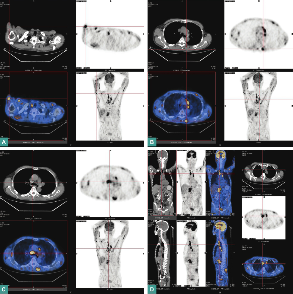①全身肌肉多发高代谢灶,右侧锁骨上窝、纵隔内及腹膜后多发高代谢结节影;②右肺上叶后段及右肺中叶近胸膜下少许小结节影,代谢未见增高;③双肺散在多发斑片影、结节影、条索影,代谢未见增高;④肺气肿,双侧胸膜轻度增厚;⑤脾轻度增大;⑥双肾结石;前列腺钙化灶;⑦双侧颈部、腋窝、肝胃间隙及双侧腹股沟区多发小结节影,代谢未见增高。
