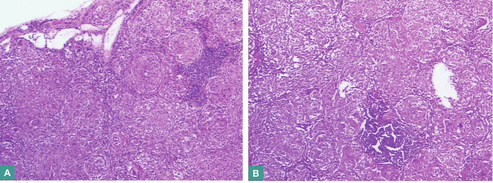 (3)为进一步明确诊断,结合全身PET-CT检查结果(右侧锁骨上窝、纵隔内及腹膜后多发高代谢结节影),请胸外科会诊,行全麻下右侧单操作孔胸腔镜下纵隔淋巴结清扫术,术中探查见右肺上叶部分粘连,奇静脉弓上、上腔静脉旁以及气管隆嵴下多发肿大淋巴结。完整切除上纵隔及气管隆嵴下数个淋巴结并送病理检查:镜下见结核样肉芽肿结节,伴少量干酪样坏死(图2),符合结核病理特征;特殊染色:PAS染色、抗酸染色、六胺银(periodic acid-silver methenamine,PASM)染色均阴性。