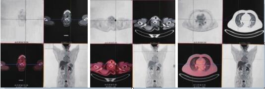 注:提示双侧颈部多发代谢增高淋巴结,双肺多发小结节,部分代谢增高。