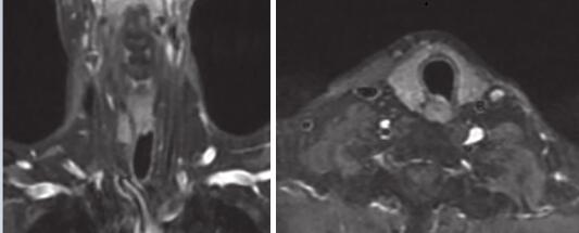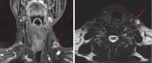 图5 颈部增强MRI:6疗程后靶病灶缩小为不可测量病灶,维持PR