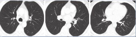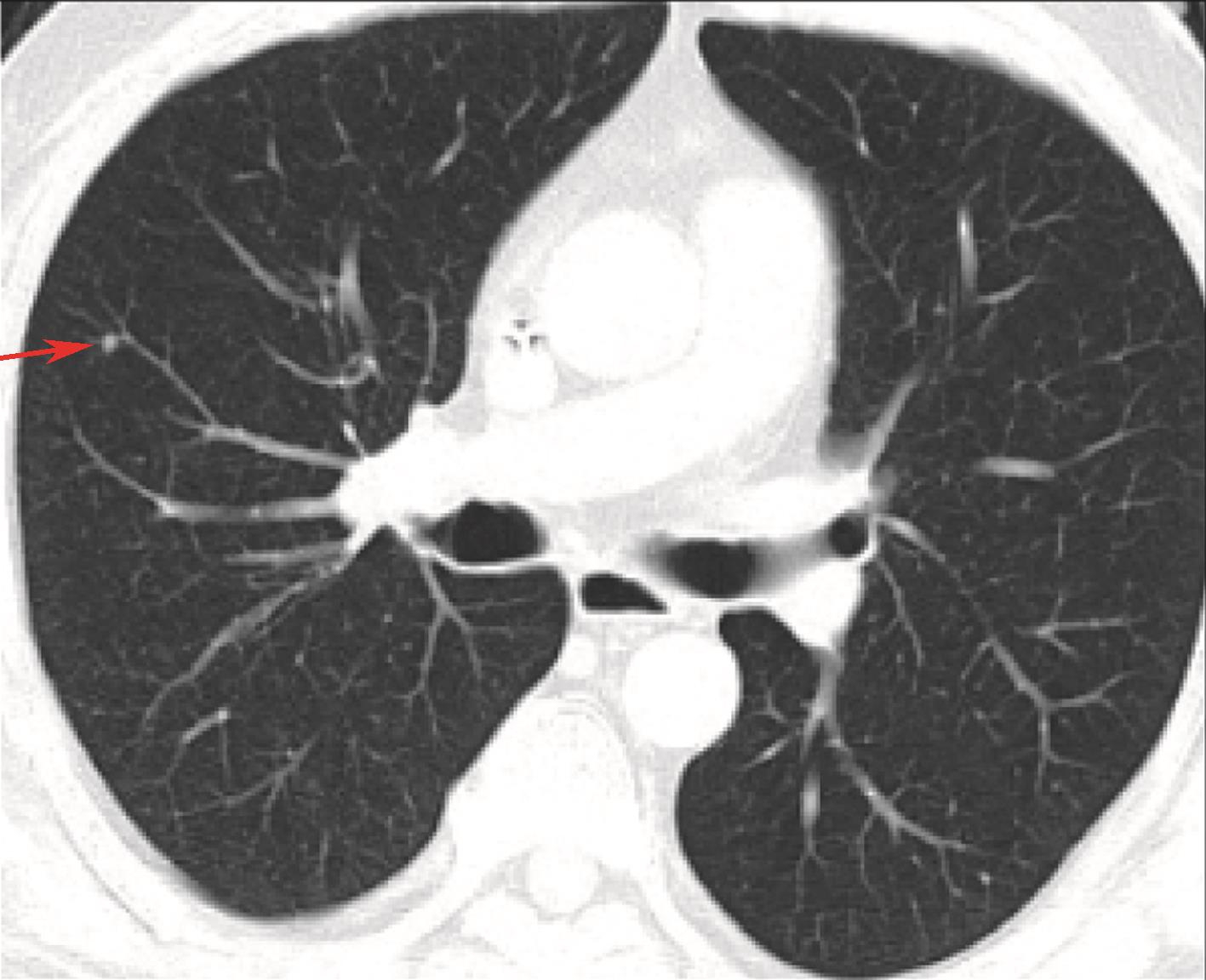 图6 2016-06胸腹盆增强CT,右肺新发小结节
