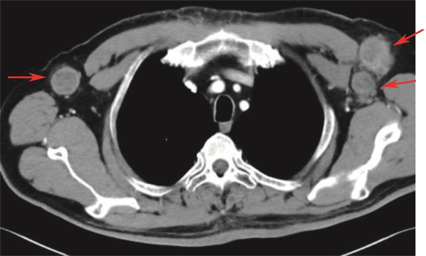 图7 胸腹盆增强CT:提示双侧腋窝多发淋巴结