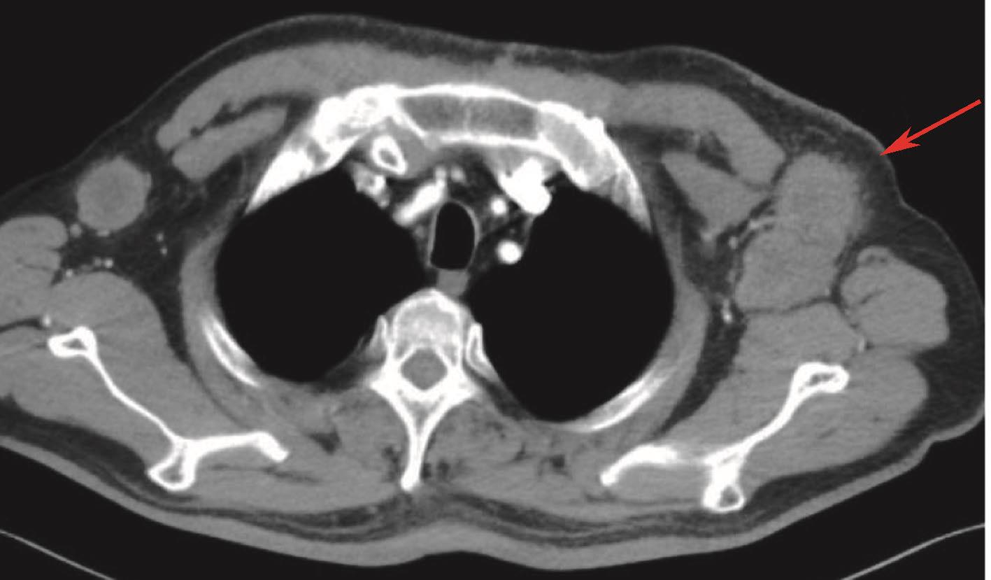 图8 胸腹盆增强CT:左侧腋窝皮下新发小结节
