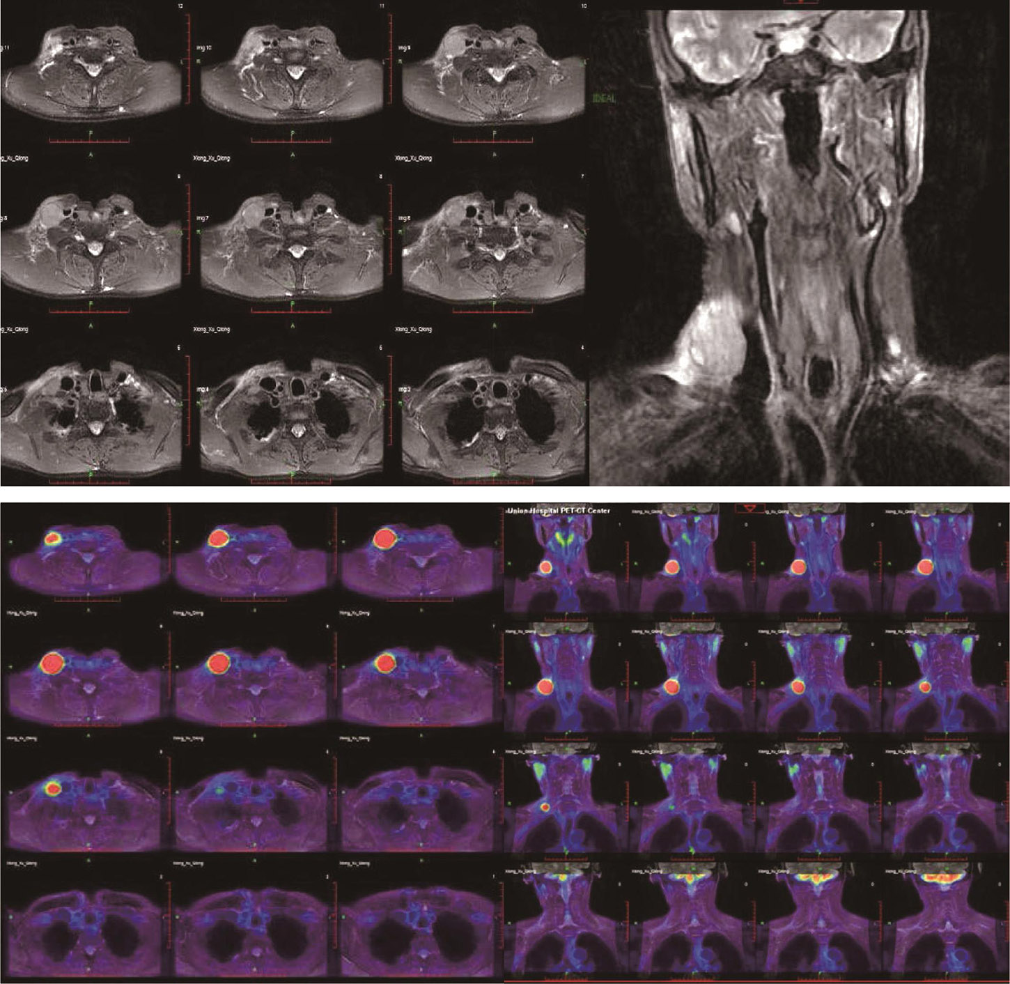 2018-11-06行全身PET-MRI:右侧下颈部及锁骨上区肿大淋巴结,代谢增高,考虑为恶性肿瘤,其他部位未见明显肿瘤转移征象(图1)。