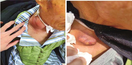 复发病史:患者初诊术后未行特殊治疗,于2018-10发现右侧颈部包块,并进行性增大,伴有局部疼痛,红肿,营养不良,一般情况较差,KPS=60。