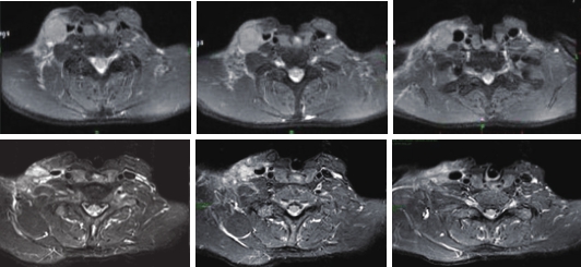 2018-11-21开始改行安罗替尼治疗(12mg/d,服用2周停1周),患者用药后病灶明显缩小,局部皮肤红肿疼痛好转(图2),复查MRI提示肿块明显缩小。服用2周期后,经MDT讨论,拟停药2周后行手术治疗。