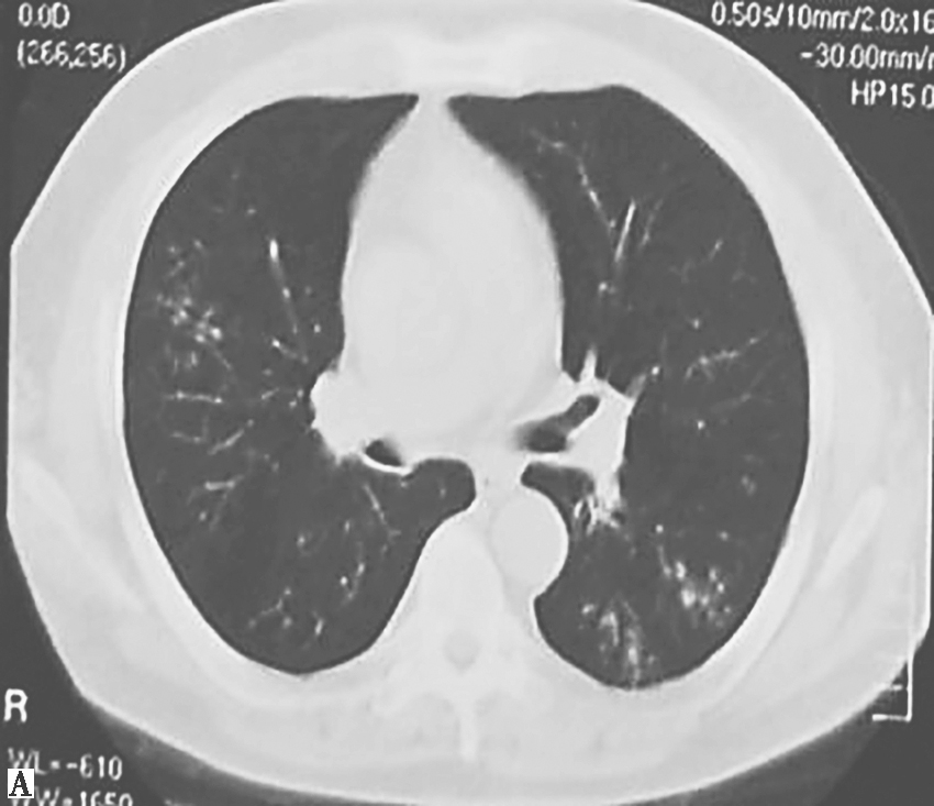 4.胸部CT表现为弥漫性细支气管炎、细支气管扩张(图1)。