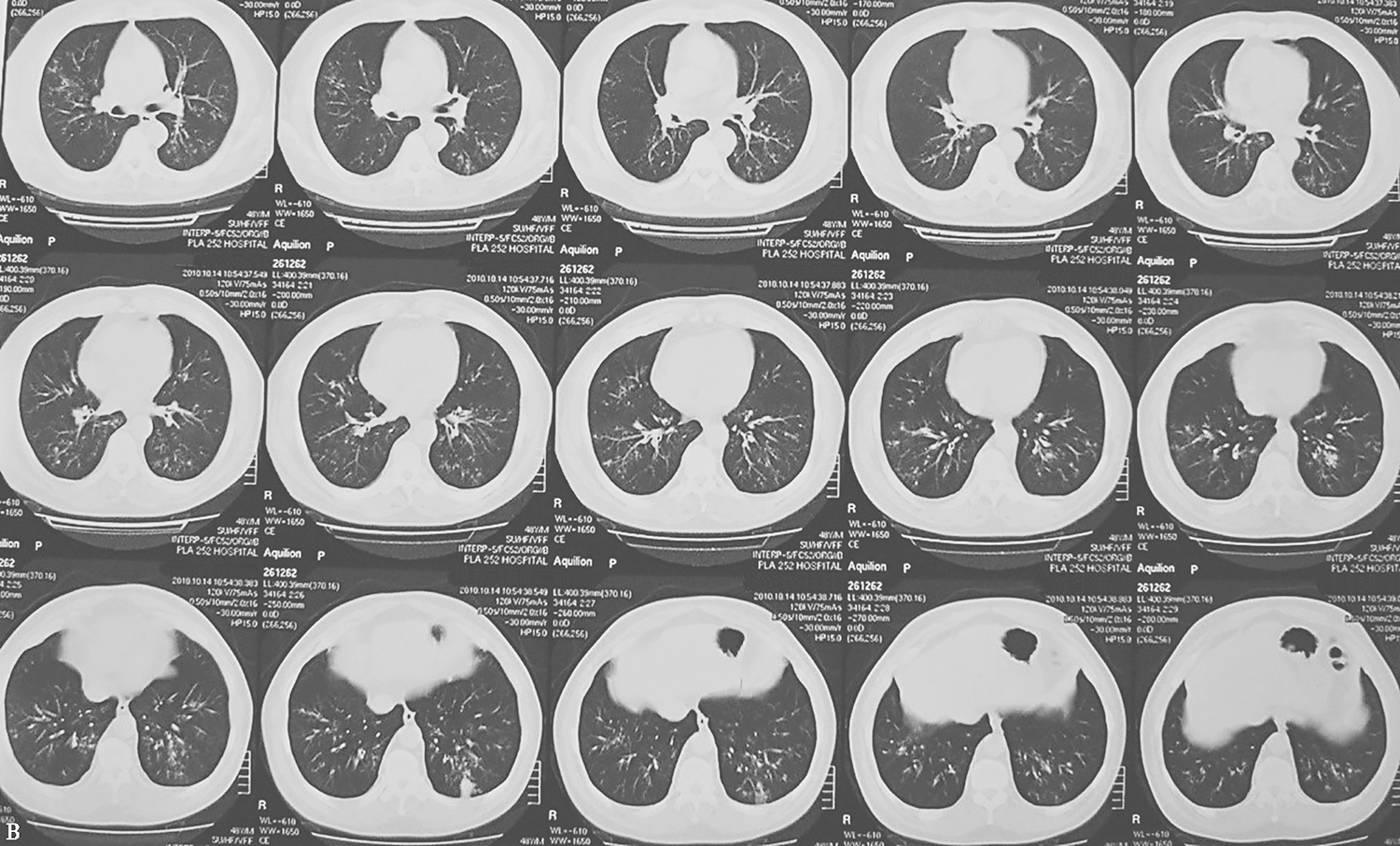 26.6mmol/L。急诊科对患者采取气管插管、机械通气,同时泵入镇静药处理,并收住急诊重症监护室。期间查血常规:WBC 9.67×109/L,N% 63.8%,嗜酸性粒细胞百分比7.4%,嗜酸性粒细胞总数 0.72×109/L,Hb 165g/L,PLT 179×109/L;尿蛋白、红细胞均阴性;肾功能、电解质、肌酸激酶(CK)均正常;总IgE 566U/L,烟曲霉特异性免疫球蛋白G、降钙素原、真菌G试验均阴性;ANCA阴性;痰涂片可见有隔菌丝,分支呈45°,似曲霉菌;痰培养显示有黄曲霉菌及构巢曲霉菌。胸部CT显示双肺多发支气管壁增厚、管腔扩张,多发小叶中心性小结节影。