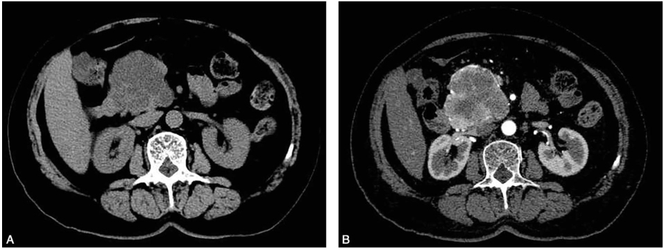 患者女性,69岁,20余天前出现腹痛,呈全腹持续性绞痛,程度较剧烈,疼痛持续数小时后缓解,伴腹泻3~4次,无其他不适。外院CT提示胰腺占位。