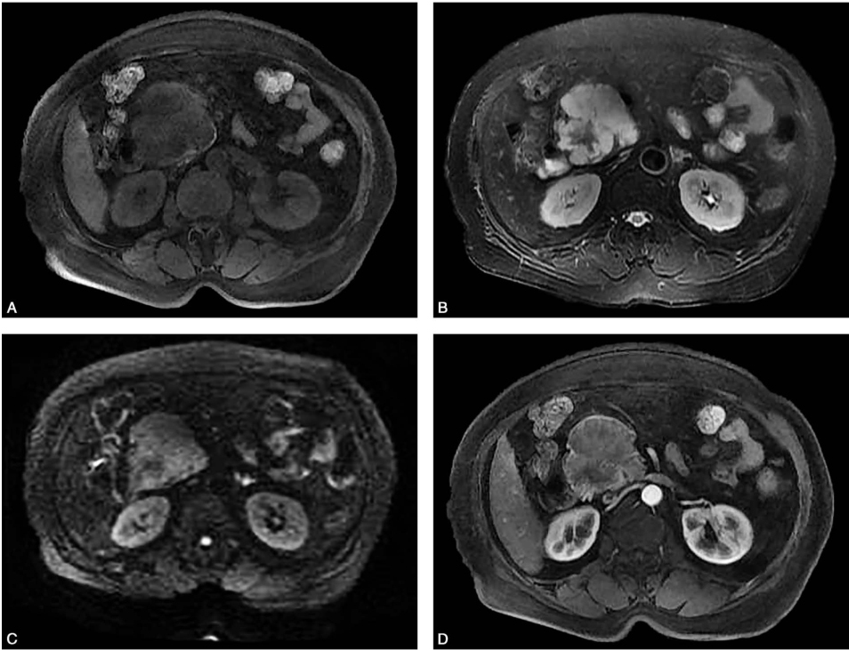 胰腺增强MRI(图2)示胰头钩突部异常信号影,囊性成分为主,T2WI呈高信号为主,局部见条片状低信号影,T1WI呈不均匀低信号,DWI呈稍高信号;病灶边缘分叶状,内可见多发细密蜂窝状分隔,并见瘢痕样改变,增强扫描病灶边缘及分隔呈明显强化。