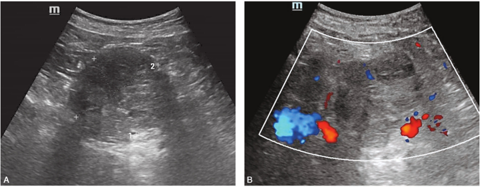 腹部超声(图3)显示胰头稍低回声团块,大小约5.2cm×5.9cm,边界尚清,形态欠规则,内部回声不均匀,似见分隔样回声,纵切面病灶呈大分叶状,内可见少许血流信号。与周边血管分界清。