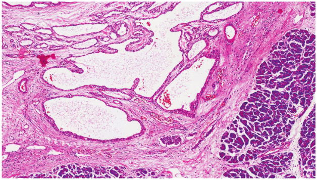 多个囊腔内衬透明的立方上皮,可见呈乳头状突向腔内,肿瘤与周围的胰腺组织分界不清。