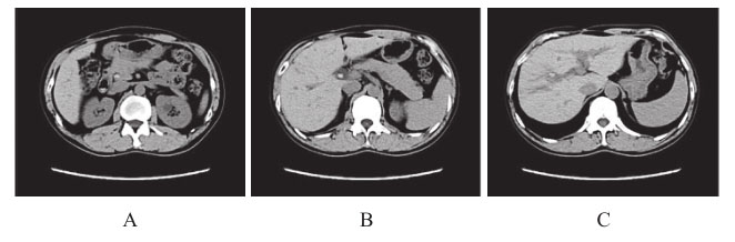 图2 上腹部CT:肝右叶胆管结石及胆总管结石