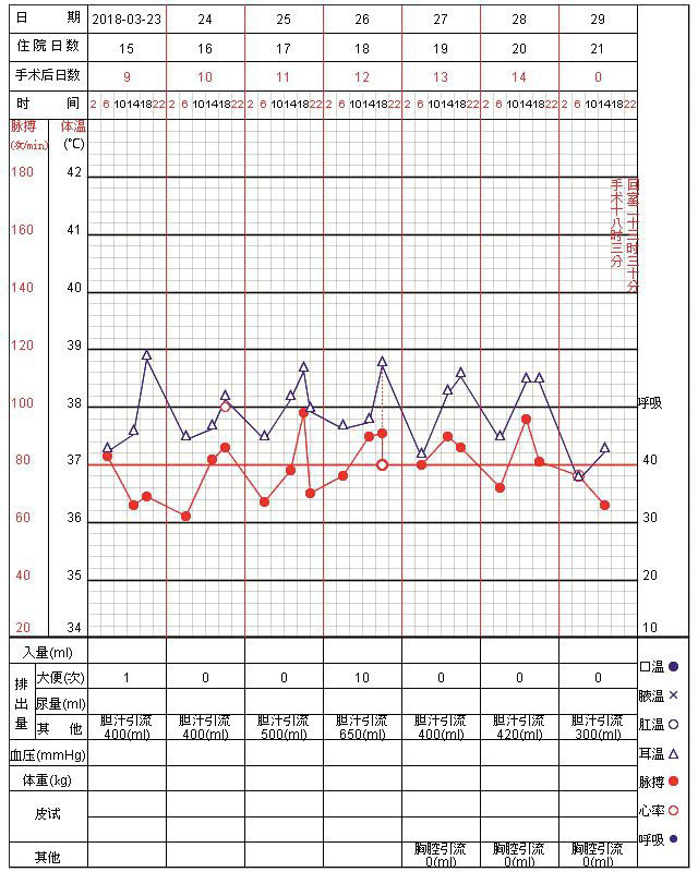 (5)患者术后发热考虑右侧大量胸腔积液所致,遂分别于术后12天及14天,两次行超声引导下右侧胸腔穿刺置管引流术,引流出淡褐色清亮液体,考虑含少许胆汁及陈旧性血液。