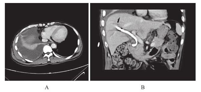 1)胸腹部增强CT:双侧胸腔积液伴两肺膨胀不全,右侧为著。经皮胆道镜碎石取石术后改变,胆管外引流管在位(图5)。