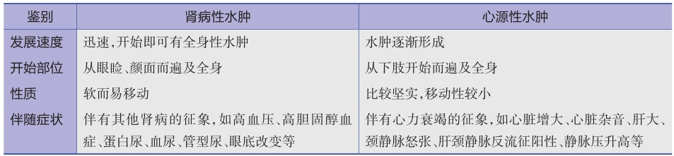 水肿、血压升高与尿改变(血尿、蛋白尿与管型尿),一般是诊断肾炎性水肿的有力证据。钠水潴留是肾性水肿的主要机制。急性肾炎引起水肿的机制几乎是肾性水钠异常潴留。肾病综合征常以高度全身性水肿、大量蛋白尿、低蛋白血症与血清胆固醇增高等为特征,其水肿的分布与体位关系不大。肾病综合征水肿的机制主要是大量蛋白尿所致的低蛋白血症,以及钠水潴留、肾小管重吸收钠过多等,后者可能由于血容量减少引起继发性醛固酮增多所致。肾病性水肿需与心源性水肿相鉴别,鉴别要点见表2。