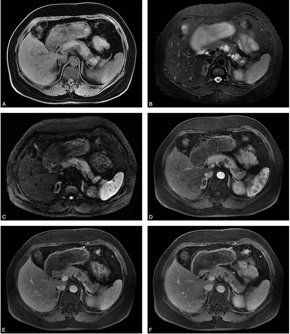 腹部MRI增强(图2)示胰体尾多发类圆形异常信号灶,T1WI呈低信号,T2WI呈高信号,DWI呈低信号,部分其内可见分隔影,增强扫描分隔可见强化,囊性成分未见强化。