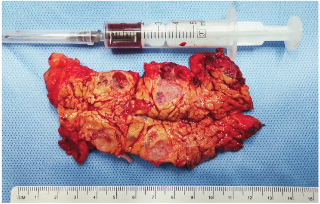 完善术前评估,排除手术禁忌后行腹腔镜下保留脾脏的胰体尾切除术(Kimura法)。术中见:胰腺质地软,胰体尾可及多发囊性占位性病灶,胰体部较大病灶直径约2cm,胰尾部较大病灶直径约3cm,部分凸起于胰腺轮廓(图3)。主胰管无明显扩张,剖检见胰腺体部囊性病灶囊液清亮透明,不黏稠;胰腺尾部占位伴有囊内陈旧性出血,囊液不黏稠。术中冰冻切片病理检查考虑微囊型SCN。胆囊壁略增厚,胆囊内见一枚结石,直径约3cm,囊壁光整。