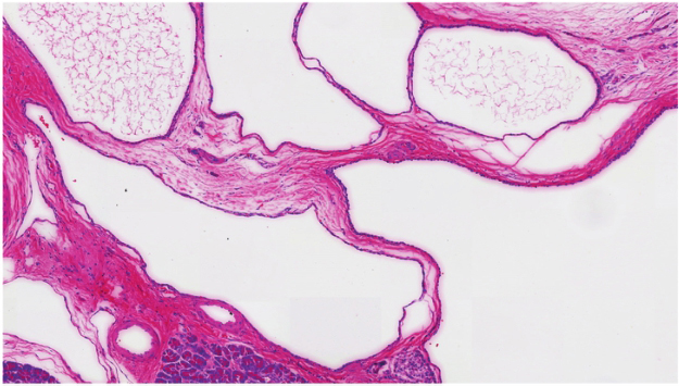 多个囊腔形成,囊内衬单层扁平上皮,胞质透亮。