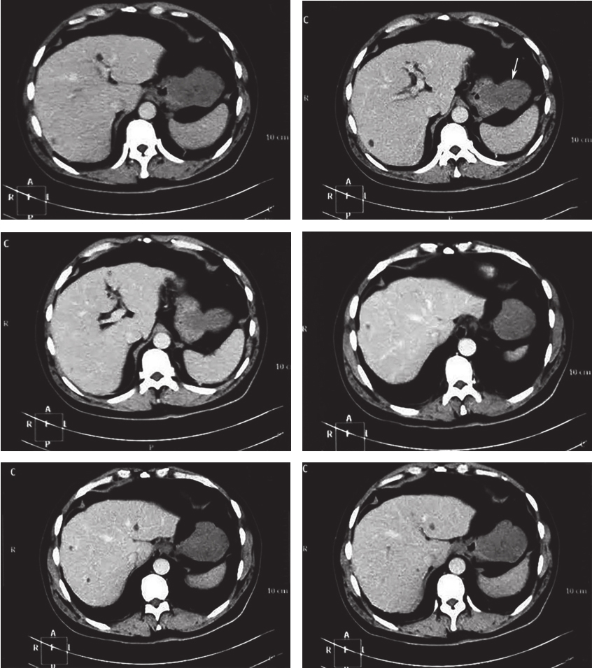 腹部增强CT:胃底部占位灶,考虑GIST?肝内多发囊肿,胆囊多发结石,双肾多发囊肿(图1)。