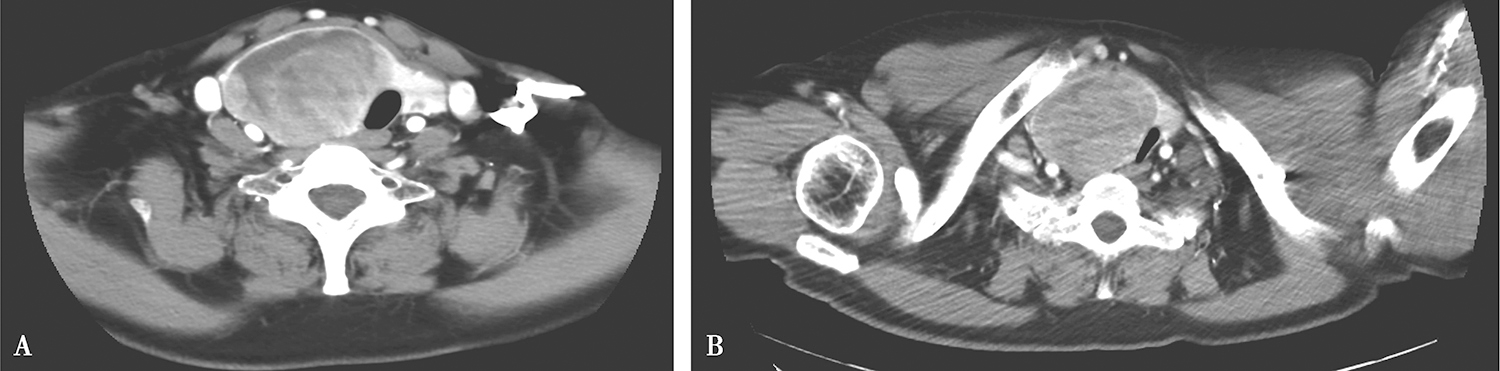 甲状腺增大,其内多发结节及肿物,以右侧病变明显,约5.2cm×6.7cm,边界清楚,部分伸入纵隔,增强后实质性成分中等略不均匀强化,部分区域可见坏死(图2)。双侧颈深链及颈后三角区可见多发淋巴结肿大,大者短径约0.8cm,锁骨上、纵隔未见明确肿大淋巴结。右下肺条索,余肺内未见明确异常,心包、胸腔未见积液。