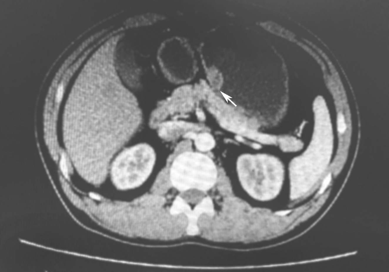 2016年9月行全腹平扫+增强CT示:胃底下部小弯侧隆起肿块影,大小约2.3cm×1.2cm,平扫CT值约50HU,增强后动、静脉期CT值约74、80HU,肿块内密度不均,病变边界清晰,邻近浆膜面光整,周围脂肪间隙清晰,未见明显肿大淋巴结。提示胃肠道间质瘤(gastrointestinal stroma tumor,GIST)可能,余无异常(图1)。