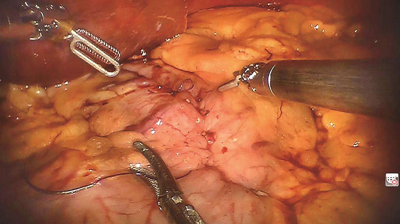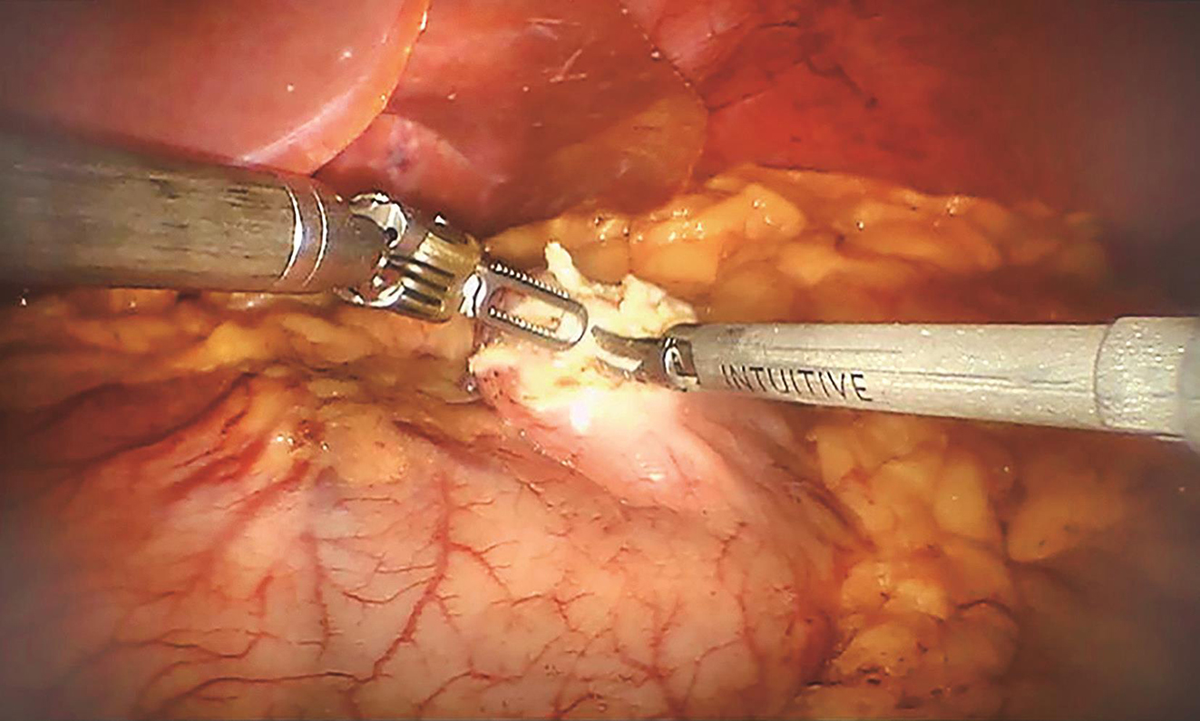 患者为中年男性,以“体检发现胃底占位1周”就诊。完善相关检查后考虑初步诊断为(胃)胃肠间质瘤,肿瘤位于胃底下部小弯侧,大小约为2.3cm×1.2cm。因肿块未侵犯周围脏器组织,故考虑先行手术切除。因肿瘤位置特殊,邻近贲门,机器人手术可提供由主刀医生控制的数十倍放大的三维高清图像,更容易分清组织器官之间的关系,减少对周围正常组织的损伤,并且机械臂操作更加灵活和精细。因肿瘤部位邻近贲门,为避免术后影响贲门功能,且患者对微创要求较高,故建议患者行机器人手术治疗。