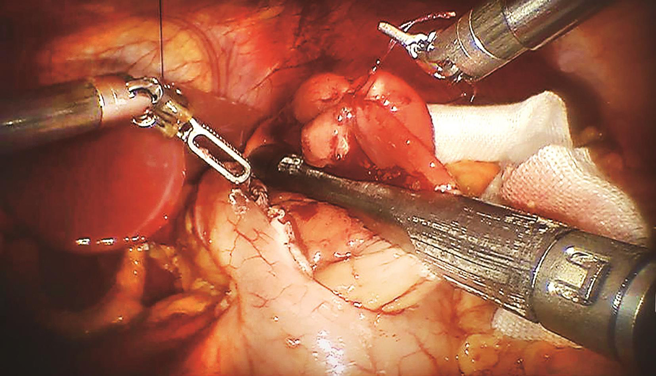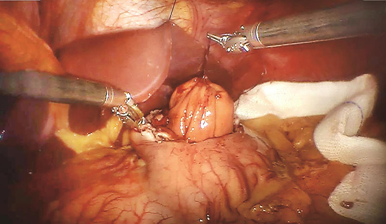 患者于加速康复外科(enhanced recovery after surgery,ERAS)理念指导下行术前准备,2016年9月27日行“机器人辅助下腹腔探查术+胃肿瘤切除术”。术中先行胃镜探查发现肿瘤位于胃底后壁近贲门处,大小约2.0cm×1.0cm;离断大弯侧网膜,暴露胃后壁瘤体,切开后壁肿瘤所对应胃前壁,以腹腔镜下切割吻合器于距离瘤体1cm处离断胃壁,完整切除肿瘤,将肿瘤置入标本袋中并用丝线结扎袋口,经绕脐半周切口取出,检查标本切缘安全,以可吸收线加固切口,缝合腹部戳孔及绕脐切口。手术过程顺利,手术时间60min,术中出血量约为10ml(图2~图5)。