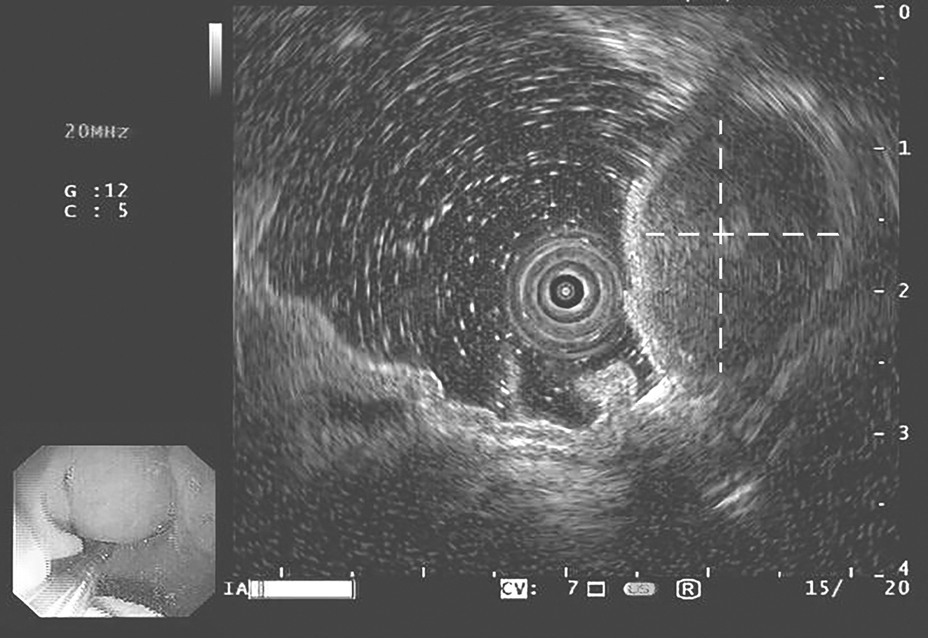 患者,女性,68岁,2016年10月因“腹痛1周”就诊于当地医院。行胃镜检查示:①胃底肿瘤;②糜烂性胃炎。当地医院给予抗炎和护胃等对症支持治疗。为求进一步治疗,患者于2016年11月至华中科技大学同济医学院附属协和医院胃肠外科门诊就诊,行超声胃镜检查示(图1):贲门大弯侧可见一隆起性病变,表面黏膜光滑,边界尚清,肿块内部回声均匀,病灶最大切面约2cm×2cm,包膜完整,起源于固有肌层,凸向腔内生长,胃肠间质瘤?门诊以“胃底占位性病变:胃肠间质瘤?”收治入院。