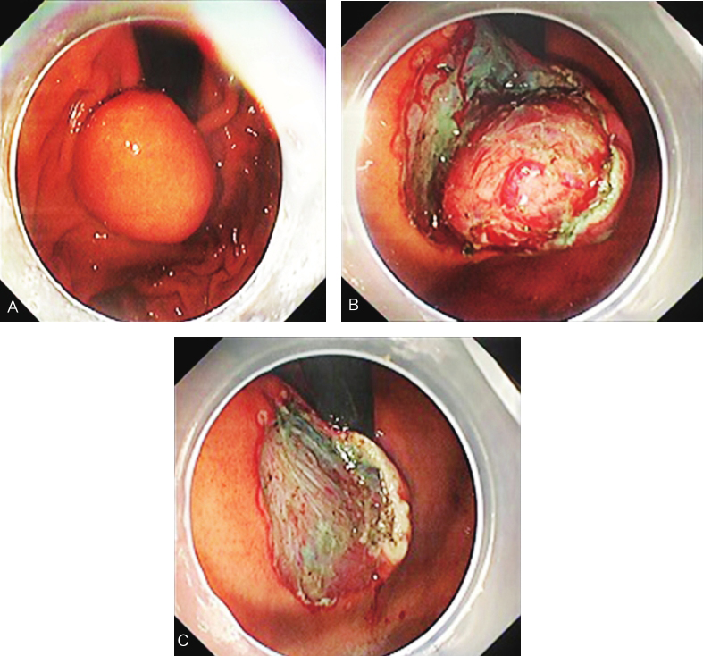 于2016年11月行“内镜下胃底隆起性病变剥除术”。患者全身麻醉后,行内镜探查病灶,于贲门大弯侧见一直径约2cm隆起病变。手术步骤如下:①使用氩离子凝固术(APC)对病灶边缘进行标记;②将靛胭脂、肾上腺素和生理盐水混合配成溶液,多点黏膜下注射于病灶边缘标记点外侧;③使用针刀沿APC标记点切开肿瘤表面黏膜,显露黏膜下肿瘤;④使用一次性黏膜切开刀沿肿瘤与固有肌层的连接处进行剥离,完整剥离肿瘤,取出后送病理检查(图3)。创面未见明显穿孔,电凝止血后未见明显活动性出血。手术时间85min,出血量约为10ml。