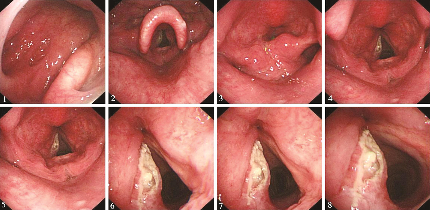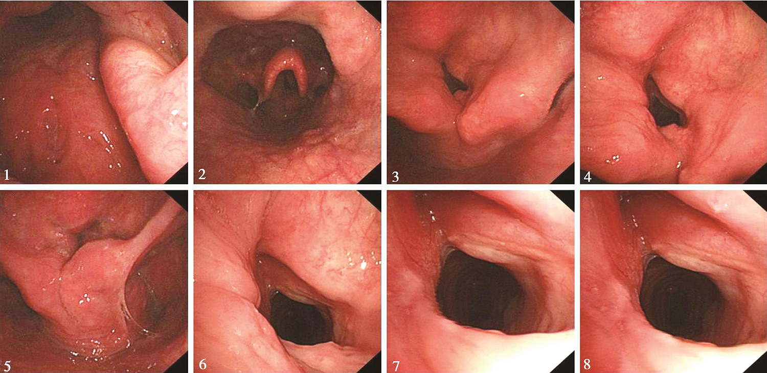 内镜所见:“喉癌术后半年”鼻腔进镜顺利。鼻咽部结构完整,黏膜光滑,未见明显异常。口咽双侧扁桃体略肿大。舌根部淋巴滤泡略增生。下咽部表面基本平整,未见明显异常。喉部结构完整,双侧披裂结构正常。左侧声带切除,右侧声带光滑。左侧喉部活动明显受限,右侧声带活动正常(图3)。