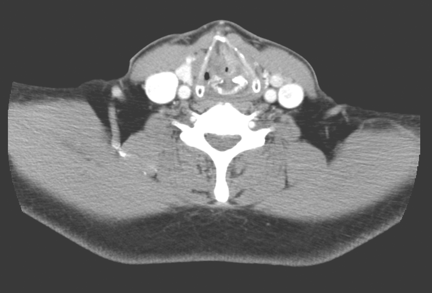 图2 颈部增强CT示左侧声带、室带局部软组织增厚伴强化