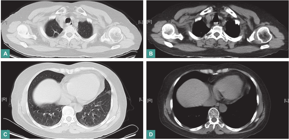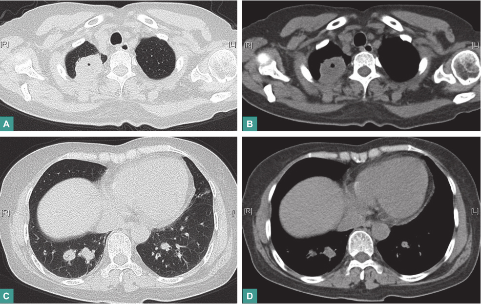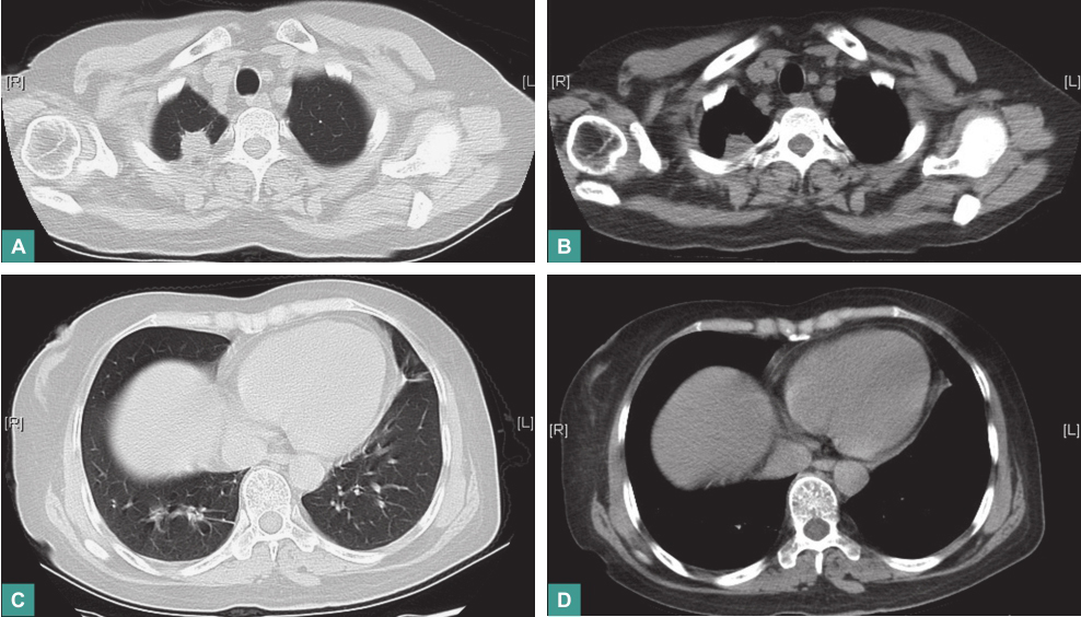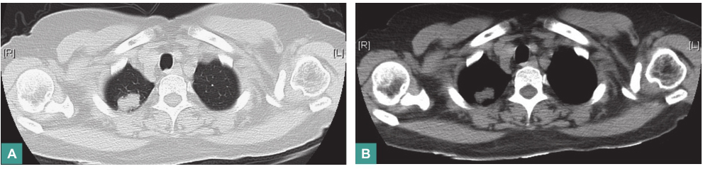 胸部CT:①右肺上叶尖段占位病变,大小约4.0cm×3.1cm,较前明显增大,其内可见空洞;②双侧肺门区及周围新增多发结节状密度增浓影;③纵隔内多发淋巴结肿大(图5)。