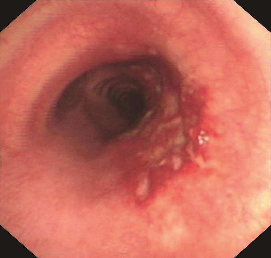 支气管镜下见气管黏膜糜烂(图2)。右中间支气管黏膜活检病理示支气管黏膜慢性炎症,鳞状上皮增生,黏膜糜烂坏死,肉芽组织增生,间质大量急慢性炎症细胞浸润,并见多核巨细胞反应(图3),刚果红染色阳性,抗酸染色阴性。