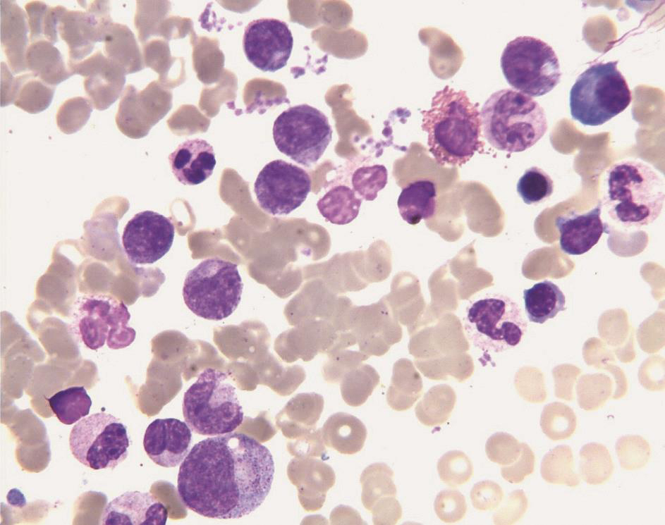 ①骨髓增生活跃,粒细胞系63%,红细胞系21.5%,粒∶红=2.93∶1;②粒细胞系增生,以中、晚幼粒细胞比例增高为主;③红细胞系以中、晚幼红细胞为主,形态正常(图4)。