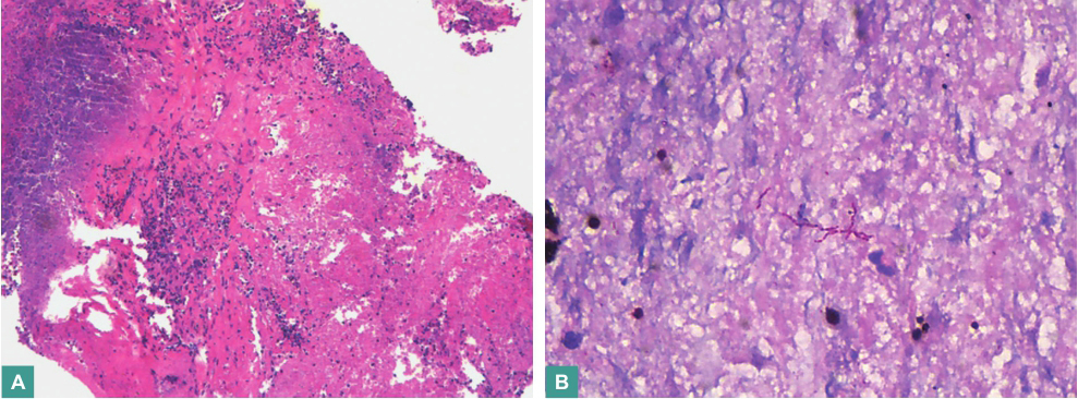 图6 右肺上叶活检病理(HE染色;A.×100;B.×400)
