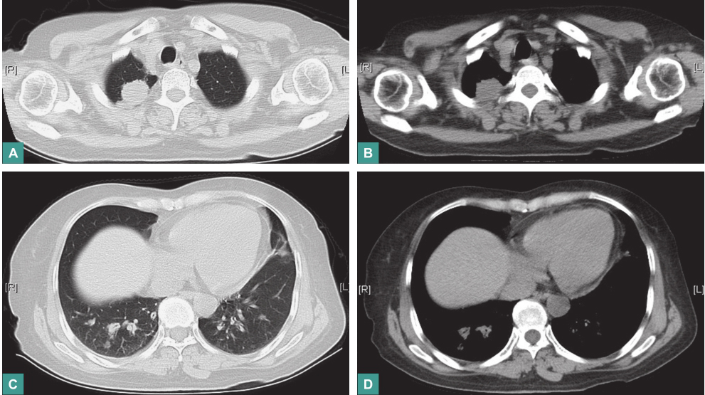 血沉42mm/h,C反应蛋白8.10mg/L。胸部CT:右肺上叶尖段占位病变较前明显缩小,双侧肺门区及周围多发结节状密度增浓影较前有所缩小,纵隔内多发小淋巴结较前有所缩小(图7)。