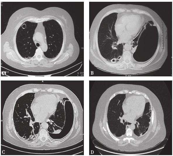 患者1年多前查胸部CT提示肺间质纤维化和肺部空洞(图1A),查G试验、GM试验、痰培养及降钙素原均无异常,未经特殊治疗。9个多月前患者于咳嗽后突发胸闷,于外院查胸部CT提示左肺气胸、右肺空洞,给予头孢哌酮舒巴坦、氟康唑后复查CT空洞变化不明显,气胸较前有所吸收。3个月前,患者着凉后出现咳嗽、咳痰及胸闷,胸部CT提示左侧大量气胸、右肺部空洞(图1B),于外院住院行胸腔闭式引流术后肺部复张。