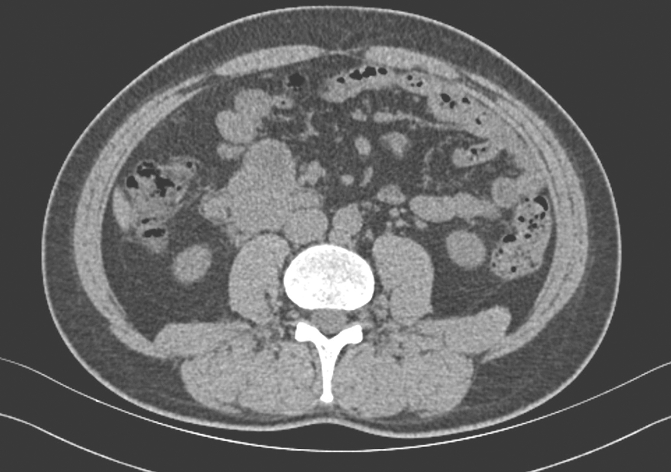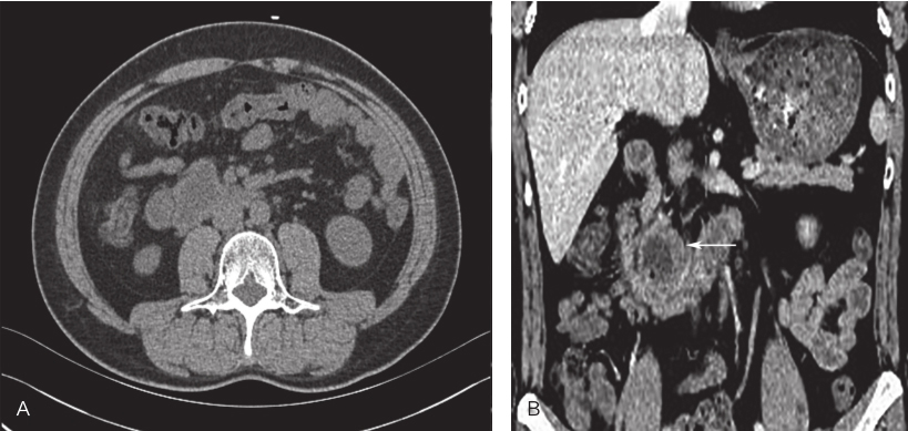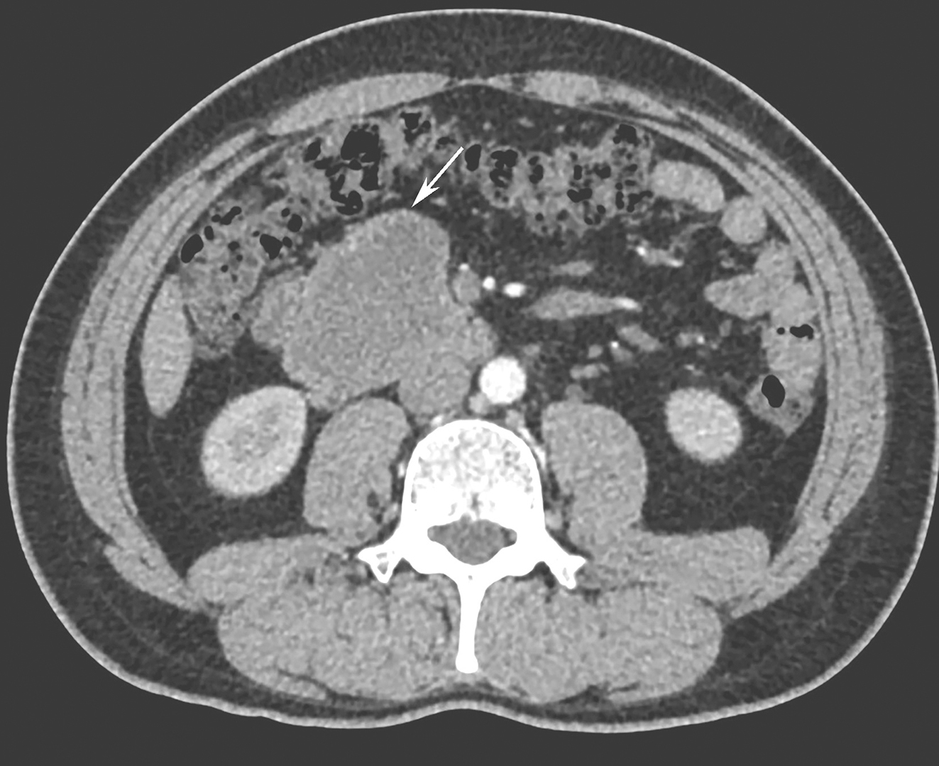 2018年12月行上下腹部、盆腔平扫+增强示:十二指肠降部见等低密度肿块影并向外生长,大小约4.9cm×3.5cm(图5),病灶边界清晰,与胰腺钩突、下腔静脉毗邻;中央见不规则液体密度影及新发少许斑点状积气影,肝固有动脉分支向病灶供血,邻近肠系膜根部多发小淋巴结,增强示边缘实性成分可见强化,中心区域低密度影区未见明显强化。余同前。