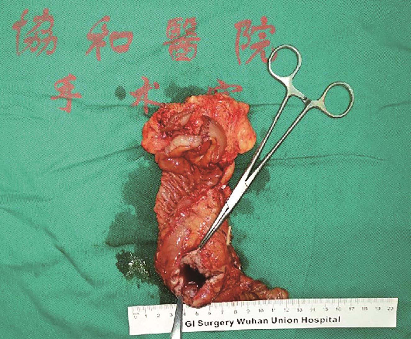 患者于2018年12月21日行腹腔镜下十二指肠切除术+胆肠吻合术+胰肠管吻合术。术中探查发现十二指肠降部内侧近乳头处可见一包块,大小约4cm×4cm。打开胃结肠韧带,显露胰腺,游离十二指肠;于胃体中下1/3处离断,断端缝合止血,解剖、离断十二指肠动脉,分离胰腺上下缘,于胰腺颈部离断,十二指肠于水平部离断。右侧腹直肌切口开腹后,屈氏韧带下方空肠穿横结肠系膜行胰肠吻合及胆肠吻合。输入襻与输出襻空肠行空肠布朗吻合。生理盐水冲洗止血,于胆肠吻合口及胰肠吻合口下方各放置橡胶引流管一根。