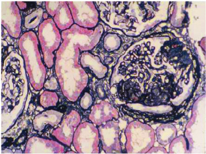 图1 第二次肾活检:肾小球毛细血管袢节段性硬化(PASM×200)