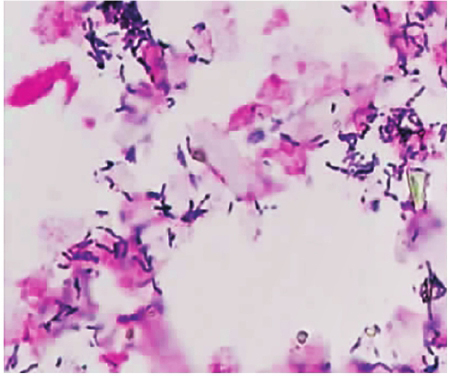 图2 血培养结果(革兰氏染色,×100):革兰氏染色呈紫色,阳性菌,分支状,呈辐射状生长