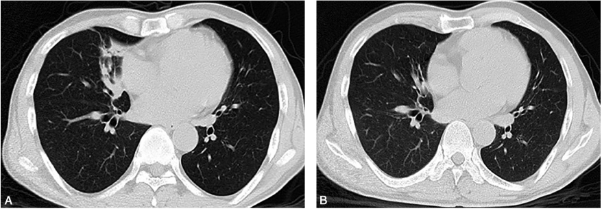 图3 胸部CT随访:青霉素治疗后3个月胸部CT(B)显示较治疗前(A)病灶已基本吸收消散