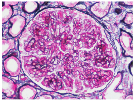 图2 特发性Ⅰ型膜增生性肾小球肾炎:肾小球呈分叶状,系膜细胞和基质增多,广泛插入,毛细血管壁增厚,双轨征形成。(PASM+Massom ×200)
