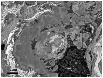 因此,目前根据免疫荧光中免疫球蛋白(Ig)和补体的结果提出了新的MPGN分型方法。①多克隆免疫球蛋白和补体均阳性的MPGN:由于长期抗原刺激,循环中形成抗原-抗体复合物并在肾小球沉积,免疫复合物通过经典途径激活补体,从而造成肾小球损伤,主要见于慢性感染、自身免疫性疾病;②单克隆Ig沉积引起的MPGN:见于单克隆免疫球蛋白血症;③Ig阴性而补体C3阳性的MPGN:见于C3肾小球病(C3 glomerulopathy)。是由于补体旁路调节异常,补体旁路过度激活,补体成分在肾小球沉积引起炎症反应,从而造成肾小球损伤;④Ig和补体均阴性的MPGN:见于血栓性微血管病慢性化阶段,主要是由于各种原因造成内皮细胞损伤、内皮下沉积物及系膜溶解,之后肾小球进行修复、重塑后形成MPGN的病理改变。本例患者为多克隆免疫球蛋白和补体沉积引起的MPGN,但临床无感染或自身免疫病证据,暂时被归为“特发性免疫复合物介导的MPGN”。