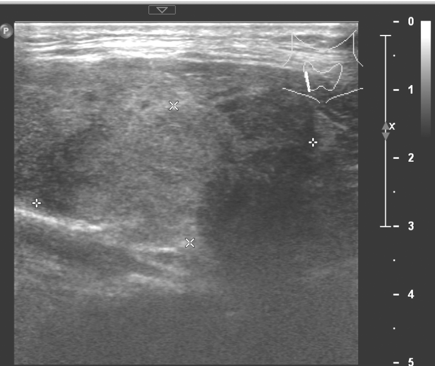 图1 颈部超声示甲状腺右叶肿物