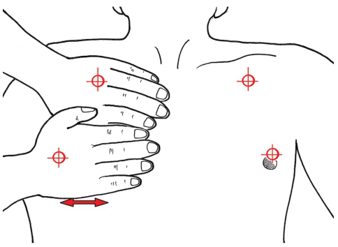 前BLUE点包括上BLUE点和下BLUE点,以经右侧胸壁检查为例,双手平放胸前,上方(左)手的第五指紧靠患者锁骨,指缘在胸骨正中水平,下方(右)手的第五指大约在肺的下前缘(膈线),腕关节重叠于腋前线。此时,上BLUE点位于左手三、四指间,下BLUE点靠近男性成人乳头,大约位于右手掌中点(图1)。为了方便临床应用,简化的BLUE方案通常只纳入2个前BLUE点的检查。