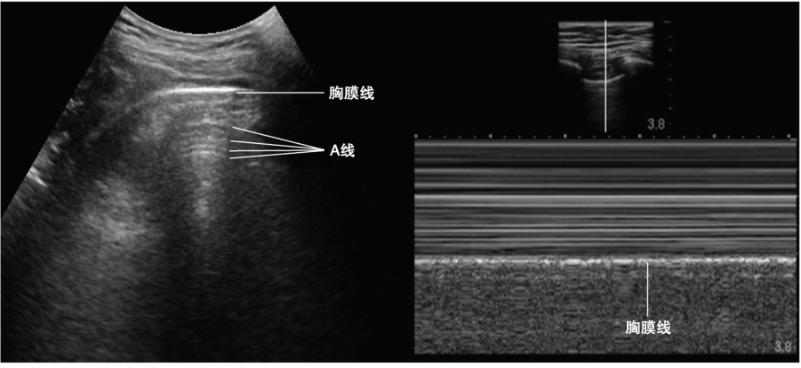 正常肺组织超声图像显示清晰的胸膜线、A线及胸膜滑动征,M型超声提示胸膜线以下区域呈均匀的“海岸征”
