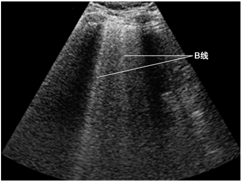 B线是起自胸膜线与之垂直地随肺滑动而运动的高回声亮线,伴有“彗星尾”征,反映了其周边肺组织内的特殊的“液-气混合状态”,同一切面出现3条以上B线提示肺间质综合征的存在(图3)。因为肺炎病灶在肺内往往并不呈对称分布,因此可以表现为肺叶之间或同一肺叶内部不同区域分别存在B征象和A线(即残留有正常肺组织的区域)。需要注意的是,当有胸腔积液时,类似的高回声亮线起自肺表面,该伪像称为假B线,并不能作为反映肺实变的可靠依据(图4)。